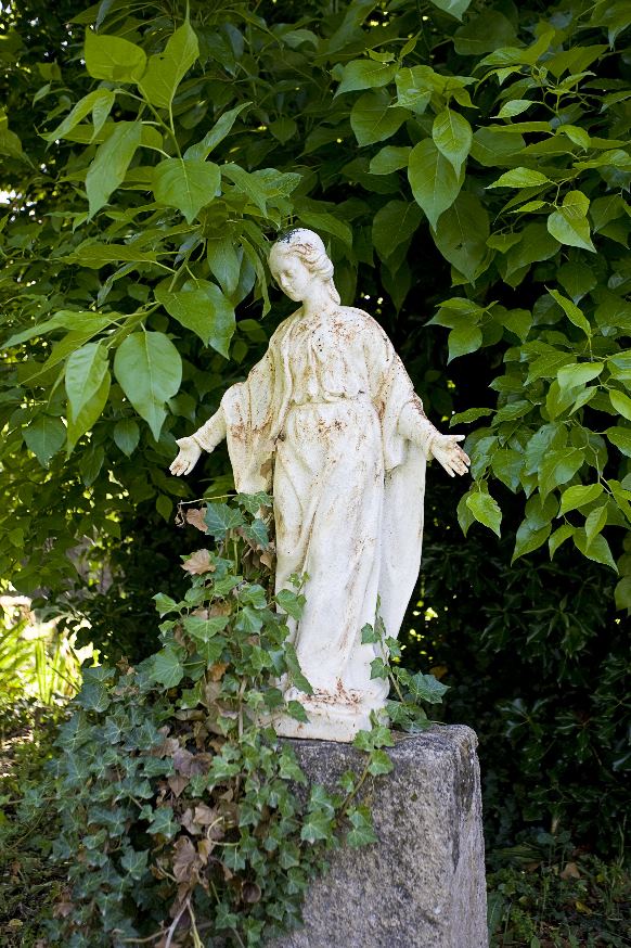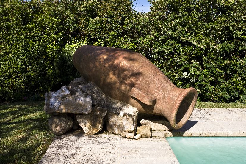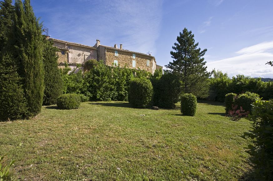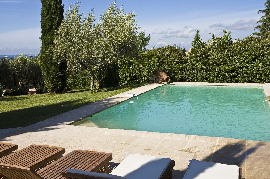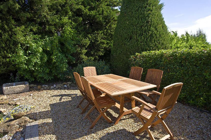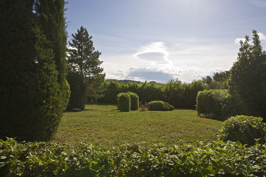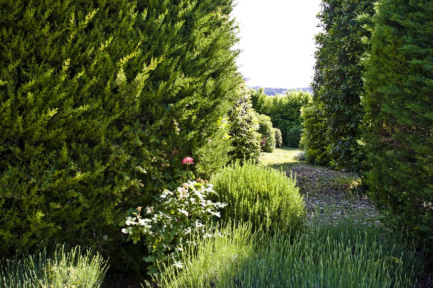 Across a small lane from the house is the large garden area. A very attractive building, looking almost like another house, contains the garage and pool equipment. On one side of this building is the lavender garden and on the other side is a pretty rose garden. Behind the rose garden is a bank of old olive trees.