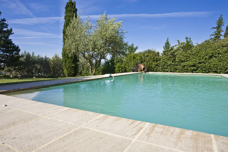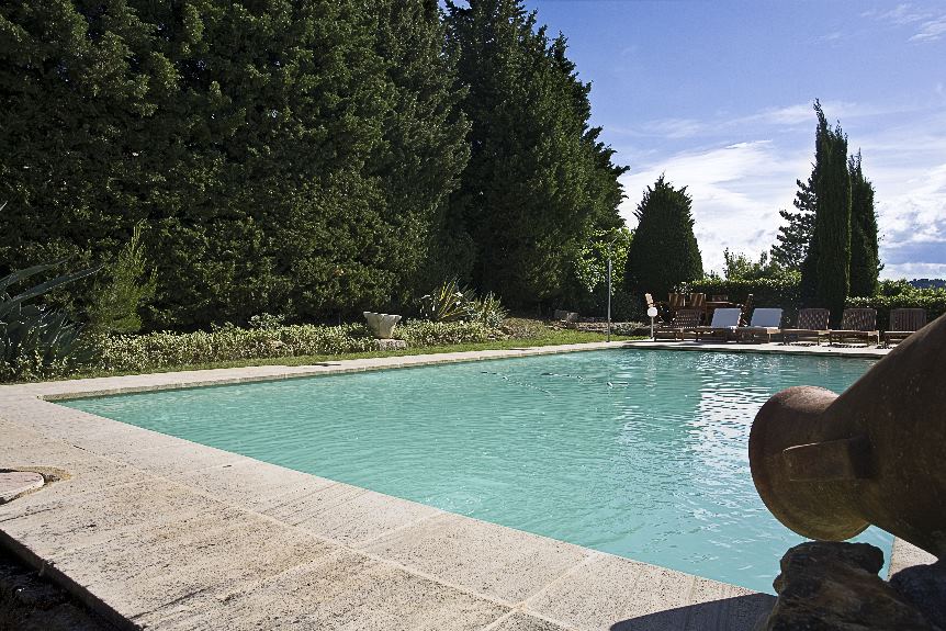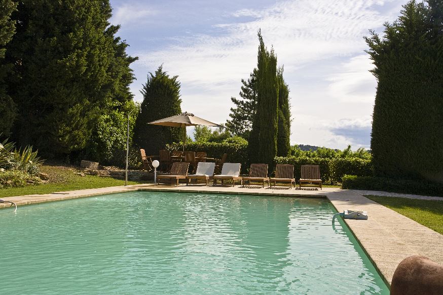 Across a small lane from the house is the large garden area. A very attractive building, looking almost like another house, contains the garage and pool equipment. On one side of this building is the lavender garden and on the other side is a pretty rose garden. Behind the rose garden is a bank of old olive trees.
